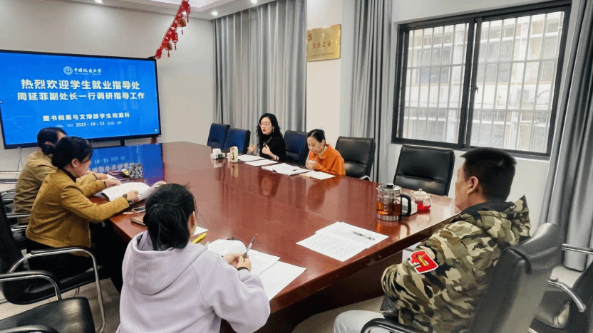为进一步优化学生人事档案转递工作流程,破解学生人事档案管理过程中的难点问题,加强部门间协同合作,2025年10月23日上午,学生就业指导处副处长周延菲、就业服务管理中心曹慧一行赴图书档案与文博部学生档案科开展工作调研。图书档案与文博部副部长刘治国、档案馆副馆长高放、学生档案科科长王黎娟及科室成员韩晓燕、柯安钢参加工作调研会议,双方围绕学生人事档案转递相关工作展开深入交流,并达成多项重要共识。