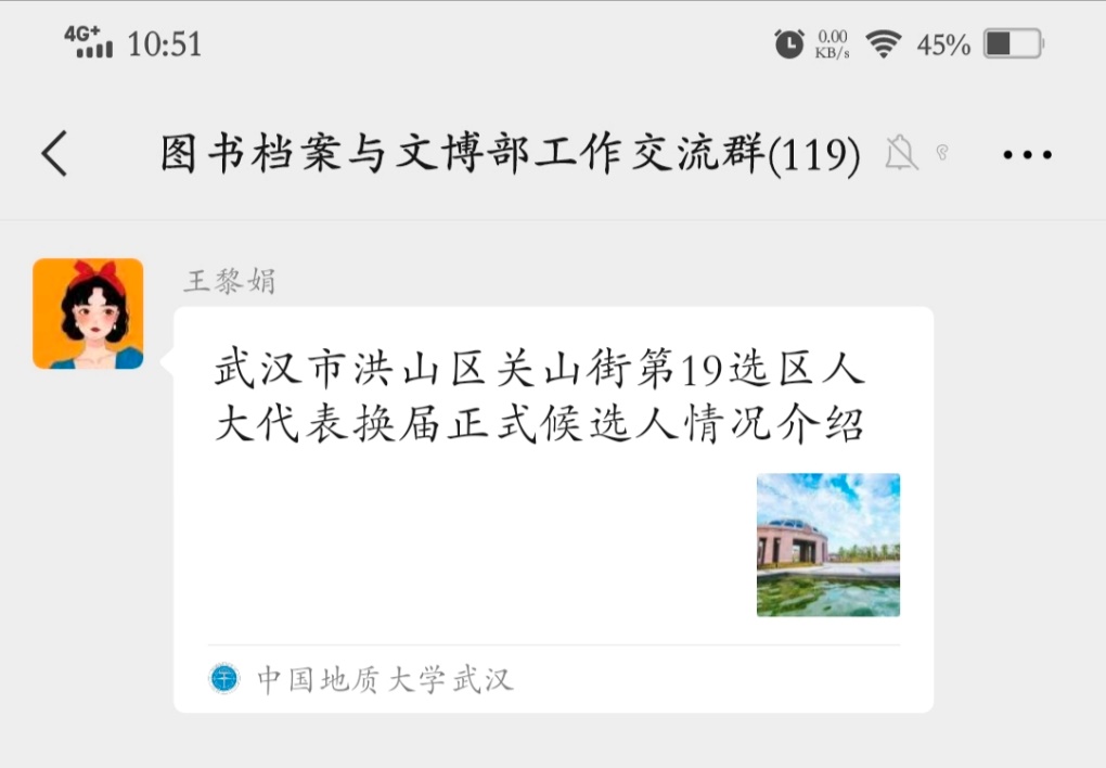 根据《洪山区关山街第19选区人大代表投票选举工作方案》,12月1日上午9时,图书档案与文博部职工凭选民证在南望山校区图书馆东门前的投票点,以本人领取选票或委托其他选民投票的方式,参加了区人大代表换届选举工作,行使民主权利,依次投下神圣庄严的一票。